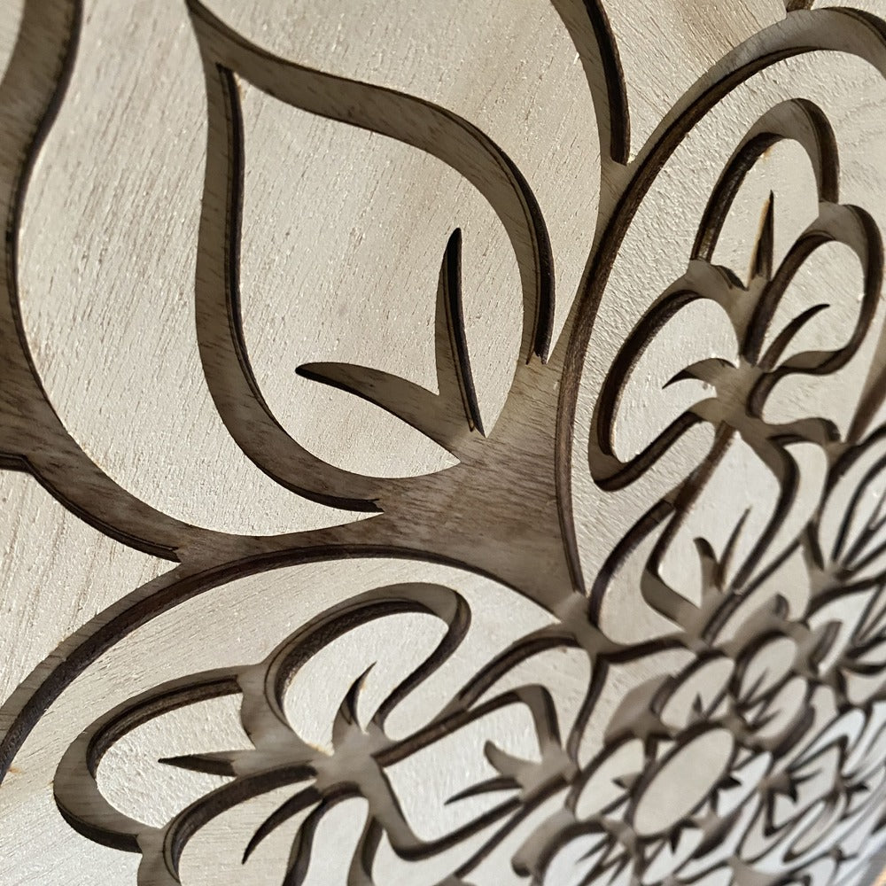 Cada tono resalta las formas y texturas de la madera, convirtiendo tu mandala en una pieza decorativa única que aporta equilibrio, calma y belleza natural a tu hogar.