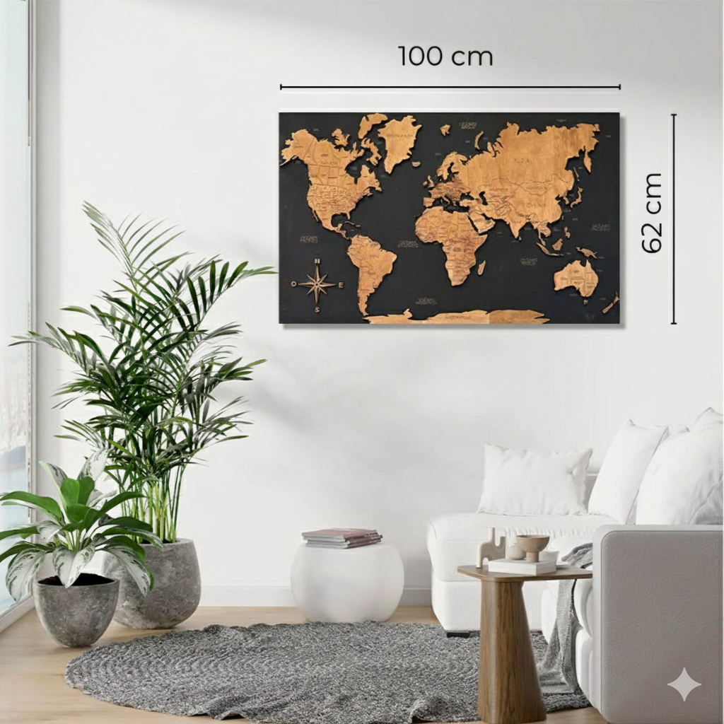 Mapamundi de madera para decoración de paredes, montado sobre un panel de madera en color negro con los nombres de mares y océanos de todo el mundo.