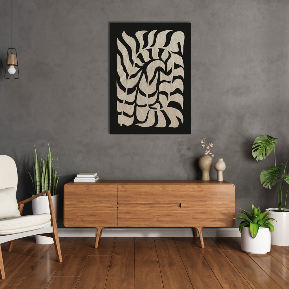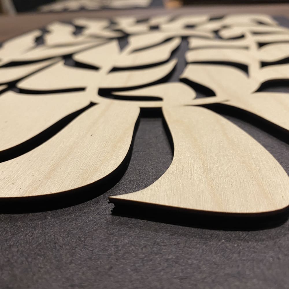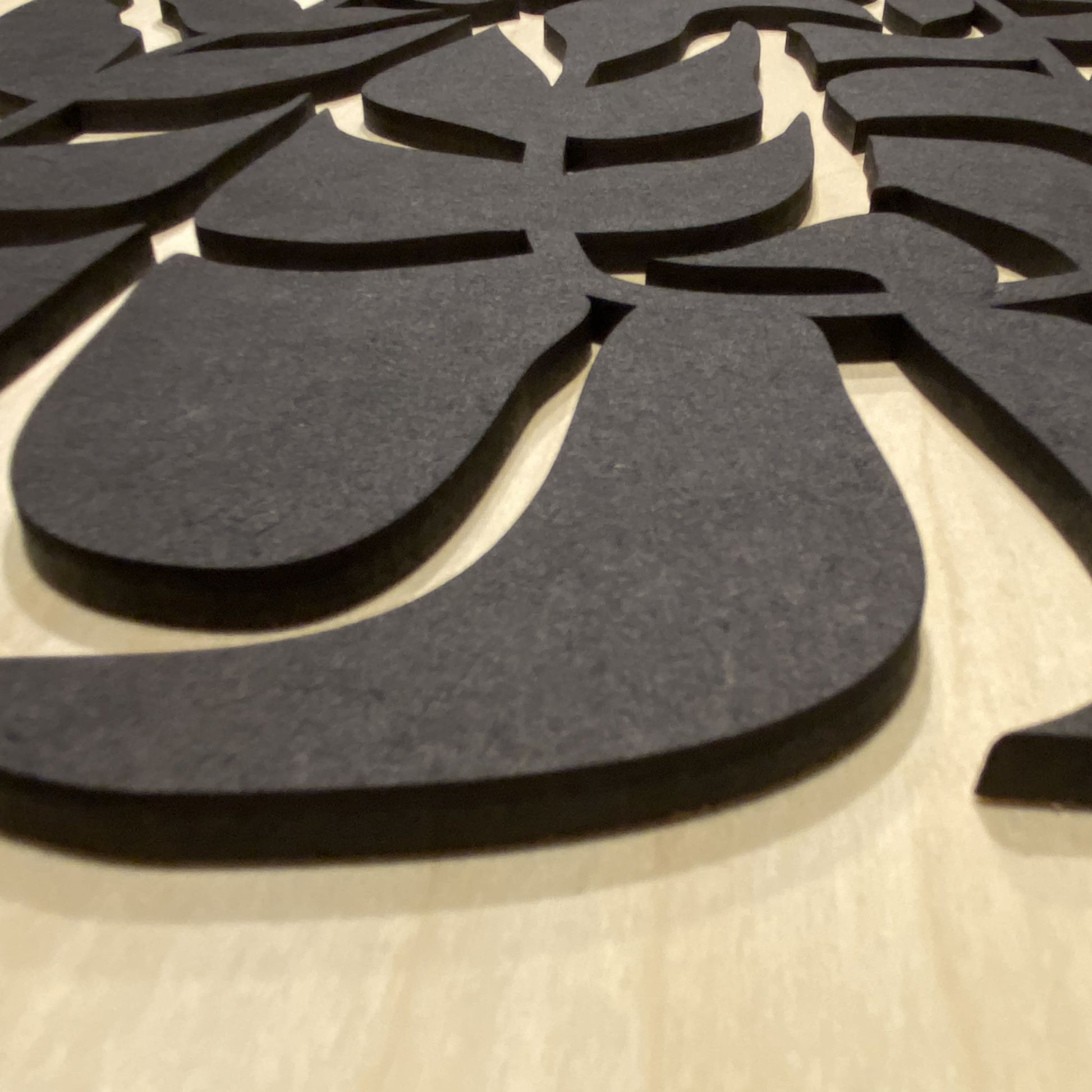 2 MDF layers: 5 mm black painted MDF wood and the letters in 5 mm natural MDF.