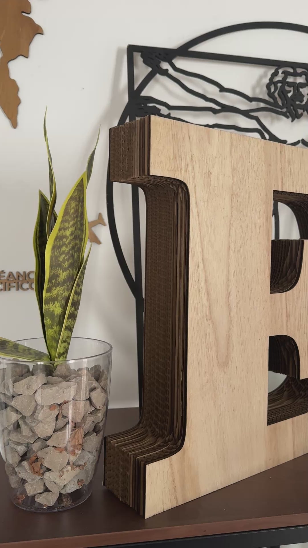 Letra inicial con frontal y dorsal de madera natural y con lateral de 10 cm en planchas de cartón encoladas con la misma forma.