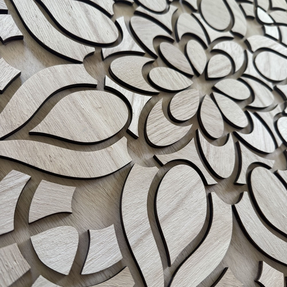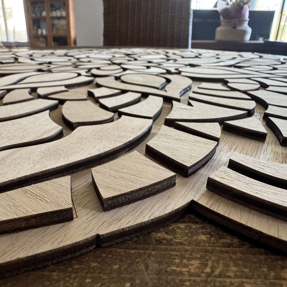 Cada tono resalta las formas y texturas de la madera, convirtiendo tu mandala en una pieza decorativa única que aporta equilibrio, calma y belleza natural a tu hogar.